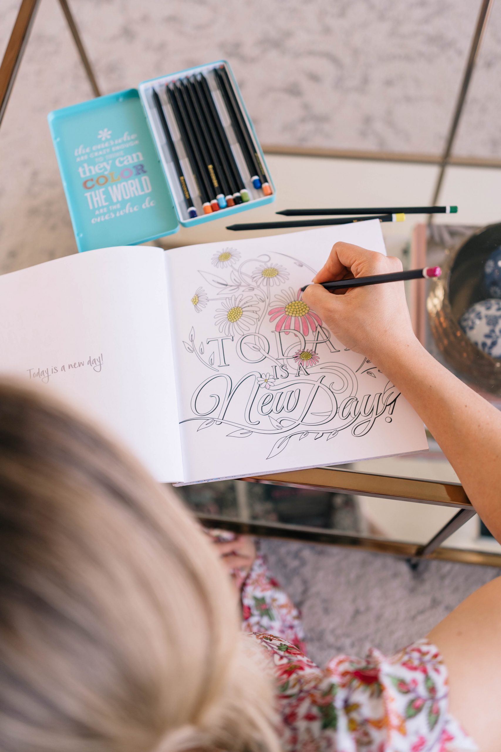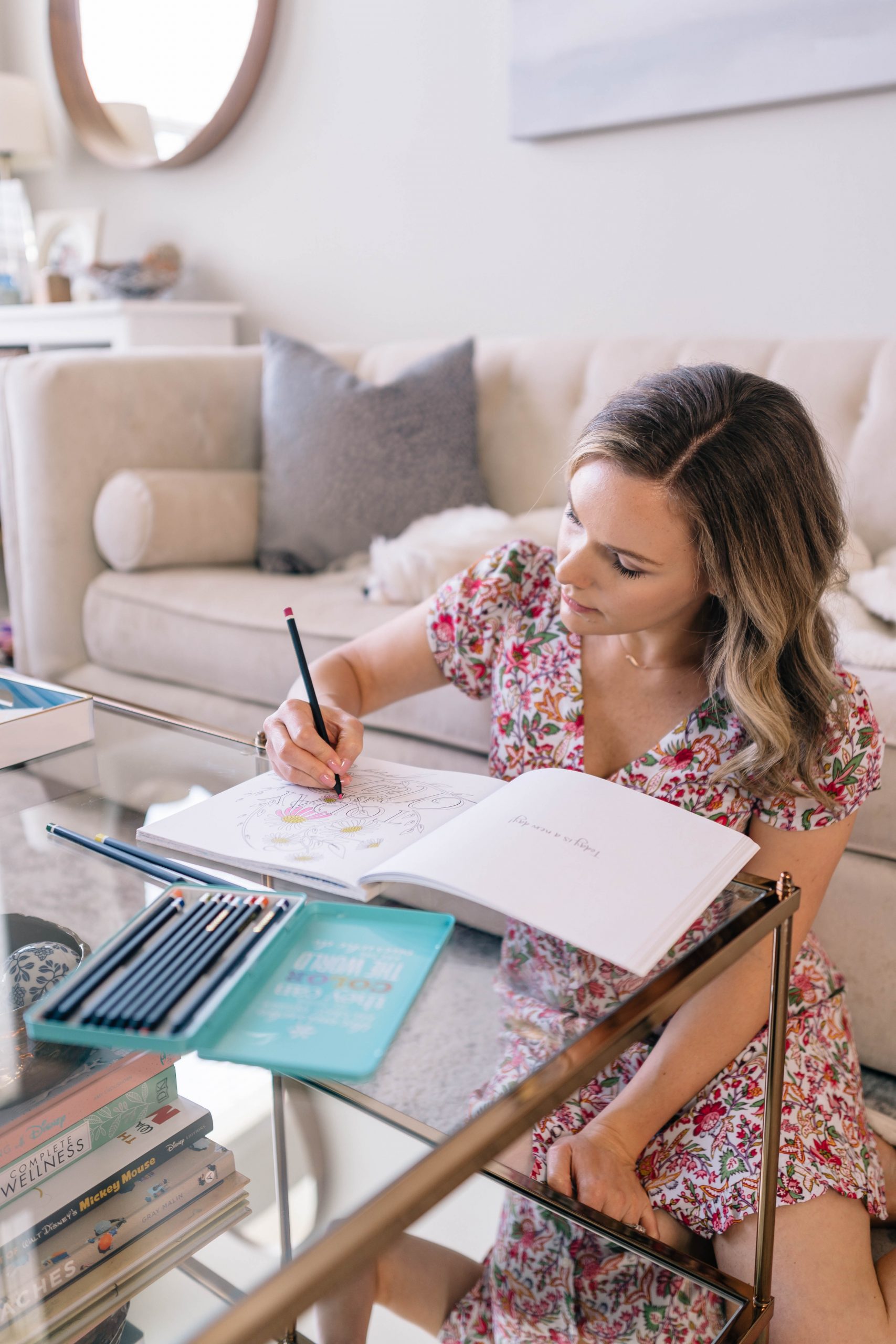 Journaling has been part of my daily routine since high school. Putting a pen to paper and writing down my thoughts helps me work through and process my feelings. Last Christmas, my mom gave me an adult coloring book and it has been a nice tool to help me de-stress. It’s calming and meditative. Coloring helps me take my mind off of the news for a bit. I try to make it as relaxing as I can by pouring myself a glass of wine, lighting my favorite candle, and playing a relaxing playlist on Spotify.